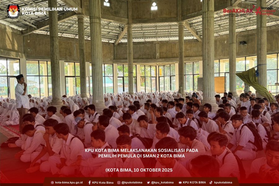 Jumat, 10 Oktober 2025, KPU Kota Bima melaksanakan Sosialisasi Pendidikan Pemilih bagi pemilih pemula di SMAN 2 Kota Bima, yang dirangkaikan dengan kegiatan Imtak di sekolah tersebut. Kegiatan ini menjadi sarana edukasi penting agar para generasi muda memahami nilai demokrasi dan berperan aktif dalam menentukan masa depan bangsa.