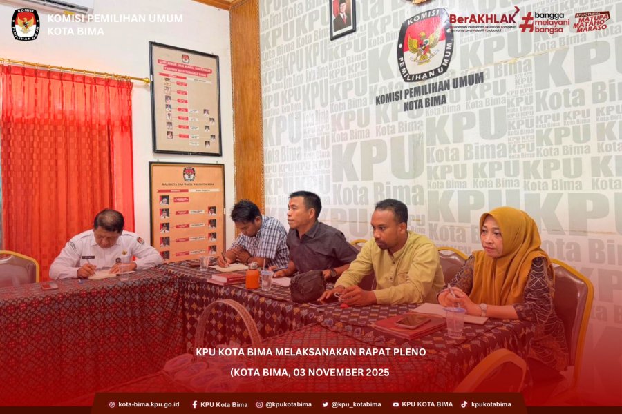 KPU Kota Bima melaksanakan Rapat Pleno yang diikuti oleh Ketua dan Anggota KPU Kota Bima, Sekretaris, serta pejabat struktural. Rapat pleno ini membahas sejumlah agenda penting, di antaranya pembahasan dana hibah, pelaksanaan coktas, pembangunan Zona Integritas, serta beberapa isu strategis lainnya terkait pelaksanaan tugas kelembagaan.