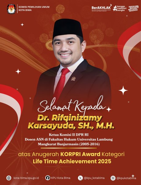 #TemanPemilih Seluruh jajaran Komisi Pemilihan Umum Kota Bima menyampaikan selamat dan apresiasi setinggi-tingginya atas diraihnya Anugerah KORPRI Award Kategori Lifetime Achievement Tahun 2025 kepada Dr. Rifqinizamy Karsayuda, S.H., M.H.