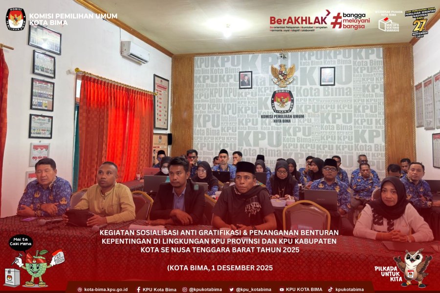 Pada hari Senin, 01 Desember 2025, KPU Kota Bima mengikuti Sosialisasi Anti Gratifikasi & Penanganan Benturan Kepentingan yang diperuntukkan bagi jajaran KPU Provinsi dan KPU Kabupaten/Kota se-Nusa Tenggara Barat. Kegiatan yang dilaksanakan secara daring melalui Zoom Meeting ini dihadiri oleh Sekretaris, seluruh Pejabat Struktural, dan seluruh staf Sekretariat KPU Kota Bima.