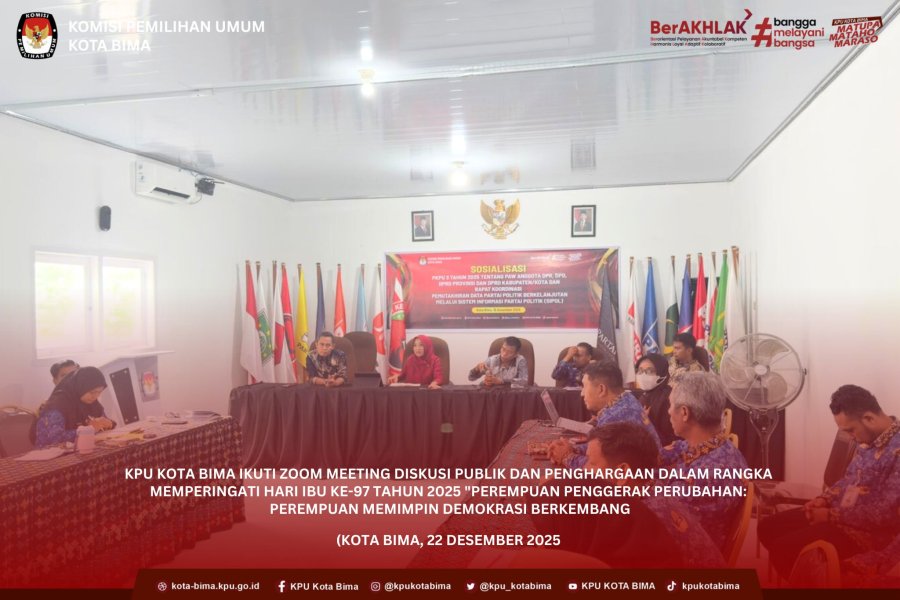 #TemanPemilih Senin, 22 Desember 2025, KPU Kota Bima mengikuti Zoom Meeting Diskusi Publik dan Pemberian Penghargaan dalam rangka memperingati Hari Ibu ke-97 Tahun 2025 dengan tema “Perempuan Penggerak Perubahan: Perempuan Memimpin Demokrasi yang Berkembang.” Kegiatan ini diikuti oleh jajaran komisioner, sekretaris, serta staf sekretariat KPU Kota Bima.