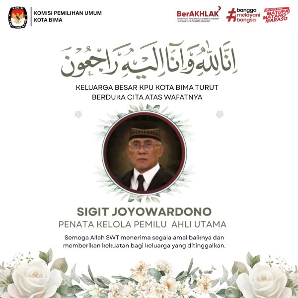 #TemanPemilih Segenap jajaran KPU Kota Bima turut menyampaikan duka cita yang mendalam atas berpulangnya Sigit Joyowardono, Penata Kelola Pemilu Ahli Utama.