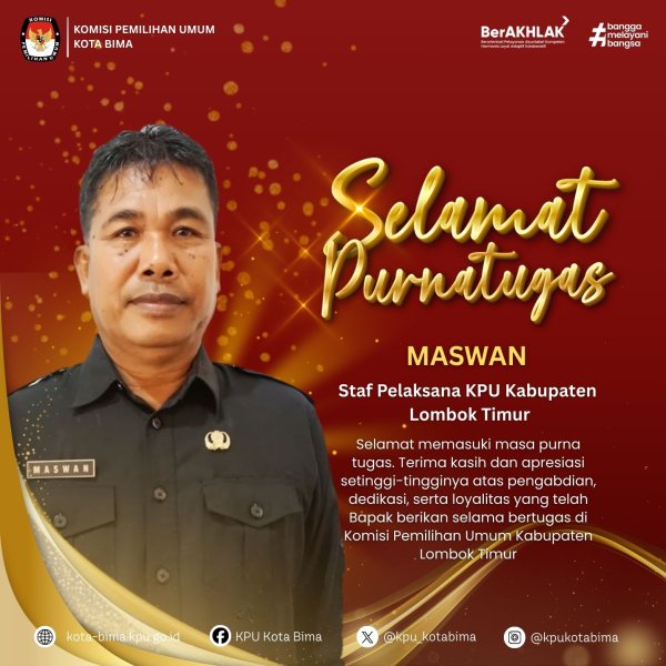 #TemanPemilih Segenap Keluarga Besar KPU Kota Bima menyampaikan ucapan selamat purna tugas kepada Bapak Maswan, Staf Sekretariat KPU Kabupaten Lombok Timur.