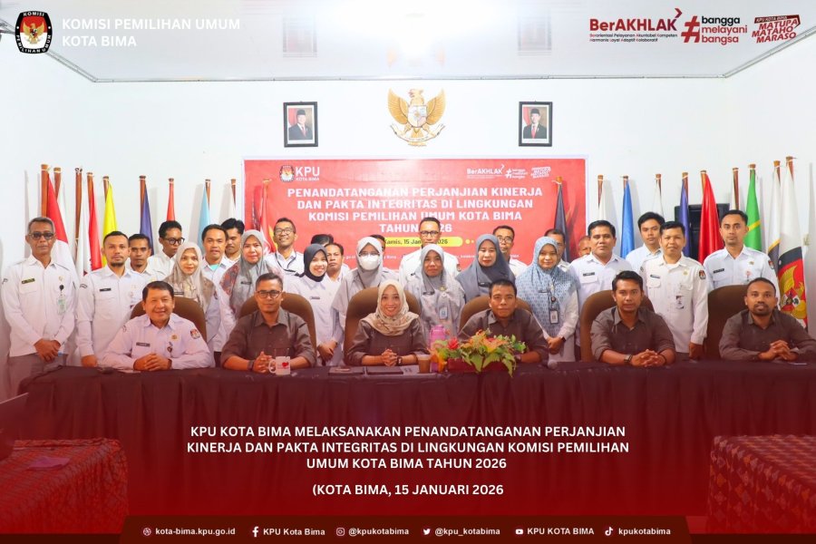 #TemanPemilih, Komisi Pemilihan Umum (KPU) Kota Bima melaksanakan kegiatan Penandatanganan Perjanjian Kinerja dan Pakta Integritas di Lingkungan KPU Kota Bima Tahun 2026 pada Kamis, 15 Januari 2026, bertempat di Aula Matupa, Mataho Ro Maraso KPU Kota Bima. Kegiatan ini diikuti oleh seluruh jajaran pimpinan dan staf sekretariat KPU Kota Bima sebagai bentuk komitmen bersama dalam memperkuat tata kelola kelembagaan yang profesional, transparan, dan berlandaskan nilai integritas.