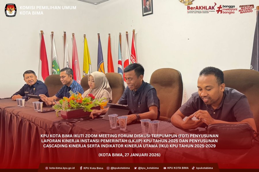 #TemanPemilih Selasa, 27 Januari 2026, Komisi Pemilihan Umum (KPU) Kota Bima mengikuti zoom meeting Forum Diskusi Terpumpun (FDT) dalam rangka Penyusunan Laporan Kinerja Instansi Pemerintah (LKjIP) KPU Tahun 2025 serta Penyusunan Cascading Kinerja dan Indikator Kinerja Utama (IKU) KPU Tahun 2025–2029. Kegiatan ini diikuti oleh Komisioner, Sekretaris, serta para Kepala Subbagian KPU Kota Bima.