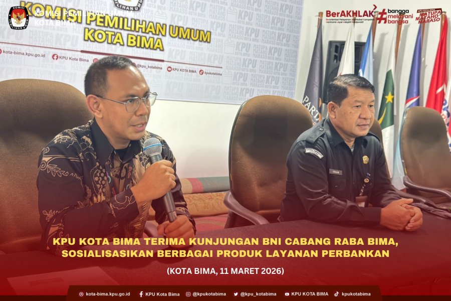 #TemanPemilih Rabu, 11 Maret 2026, KPU Kota Bima menerima kunjungan dari pihak Bank Negara Indonesia (BNI) Cabang Raba Bima dalam rangka kegiatan sosialisasi produk dan layanan perbankan kepada jajaran sekretariat KPU Kota Bima. Kegiatan tersebut dilaksanakan di Aula Matupa, Mataho, Ro Maraso dan diikuti oleh Sekretaris KPU Kota Bima, para Kepala Sub Bagian (Kasubbag), serta seluruh staf sekretariat.