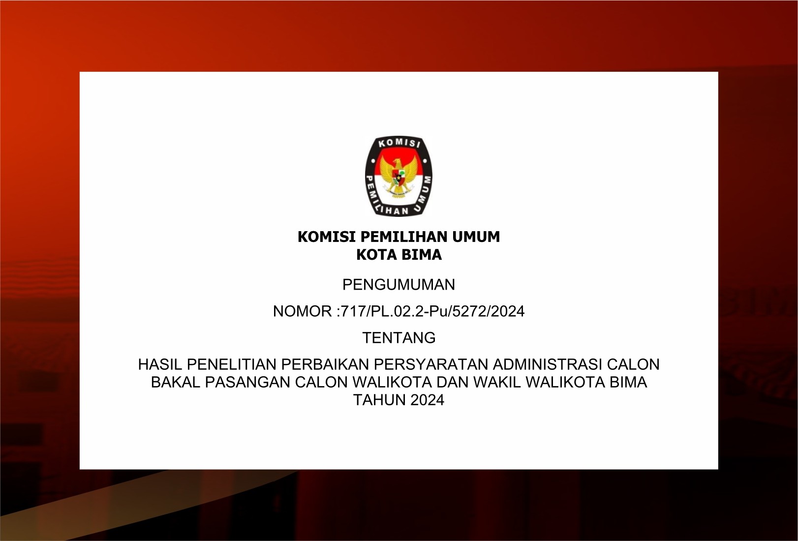 #TemanPemilih Berikut Kami sampaikan Pengumuman Nomor :717/Pl.02.2-Pu/5272/2024 Tentang Hasil penelitian perbaikan persyaratan administrasi calon Bakal Pasangan Calon Walikota dan Wakil Walikota Bima Tahun 2024.
