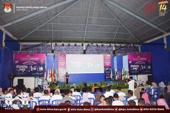 KOTA BIMA,- Dalam rangka memperingati Hari Sumpah Pemuda yang ke 95 Tahun 2023, Komisi Pemilihan Umum Kota Bima melaksanakan kegiatan KPU Goes to Campus yang dikemas dalam bentuk kegiatan nonton bersama Film Pemilu yang berjudul Kejarlah Janji. Nonton bersama Film Pemilu yang dilaksanakan di auditorium Sekolah Tinggi Ilmu Ekonomi (STIE) Bima, Sabtu (28/10/2023) yang dihadiri oleh ratusan mahasiswa tersebut, dimulai pukul 20.15 Wita.
