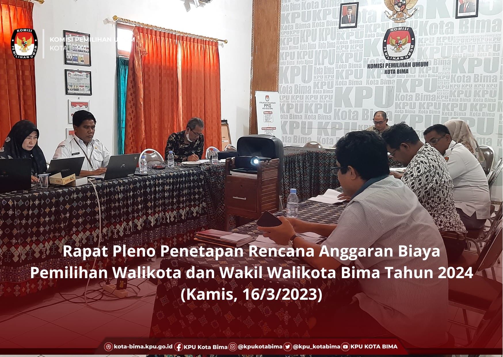 #Temanpemilih, Ketua KPU Kota Bima, Mursalin memimpin rapat pleno dengan agenda penetapan Rencana Anggaran Biaya (RAB) Pemilihan Wali Kota dan Wakil Wali Kota Bima tahun 2024, bertempat di Aula kantor KPU Kota Bima. Kamis (16/3/2023).