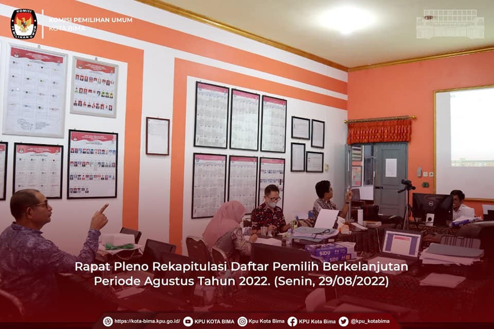 Hasil rapat berdasarkan Berita Acara Nomor : 31/PK.01-BA/5272/2022 tentang Rapat Pleno Rekapitulasi Daftar Pemilih Berkelanjutan Periode Agustus Tahun 2022 tanggal 29 Agustus 2022. Jumlah pemilih periode bulan Agustus 2022 sebanyak 105.069 pemilih dengan rincian pemilih laki laki berjumlah 50.753 pemilih dan pemilih perempuan berjumlah 54.316 pemilih, yang tersebar di 5 kecamatan di wilayah Kota Bima.