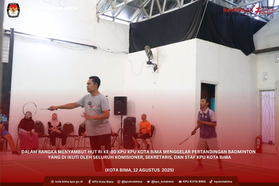 Dalam rangka menyambut HUT RI ke-80, keluarga besar KPU Kota Bima menggelar pertandingan Badminton yang diikuti oleh seluruh Komisioner, Sekretaris, dan staf.