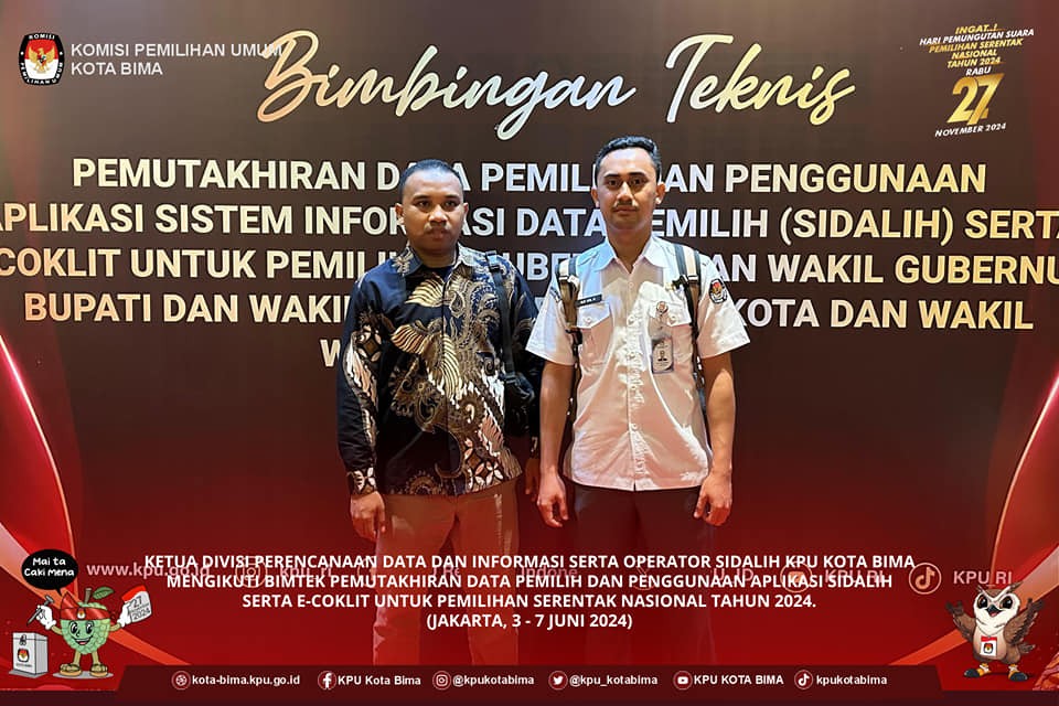 #TemanPemilih (Jakarta, 3 - 7 juni 2024) Ketua Divisi Perencanaan Data Dan Informasi dan Operator Sidalih KPU Kota Bima Mengikuti Bimbingan Teknis Pemutakhiran Data Pemilih dan penggunaan Aplikasi Sidalih serta E-coklit untuk Pemilihan Serentak Nasional Tahun 2024 Pada KPU Republik Indonesia.