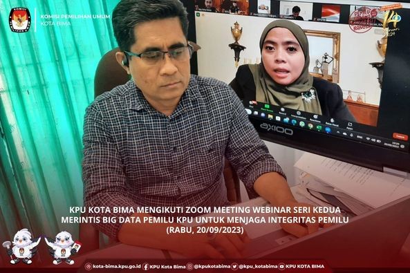 #Temanpemilih, Rabu (20/9/2023) KPU Kota Bima mengikuti Zoom Meeting Webinar seri kedua terkait merintis Big Data Pemilu KPU untuk menjaga Integritas Pemilu, guna mempersiapkan seluruh jajarannya dari tingkat Pusat hingga Kabupaten/Kota untuk mengenal, memahami dan menyiapkan diri terhadap pengguna Teknologi Informasi dan penerapan Big Data dalam penyelenggaraan Pemilu 2024.