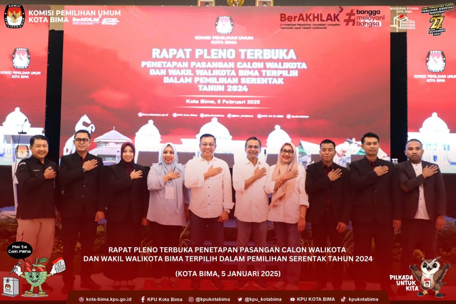 KOTA BIMA,- KPU Kota Bima menyelenggarakan Rapat Pleno Terbuka Penetapan Pasangan Calon Walikota dan Wakil Walikota Bima Terpilih pada Pemilihan Serentak Tahun 2024. Kegiatan Rapat Pleno dilaksanakan di Hotel Marina Inn Pukul 14.00 WITA.