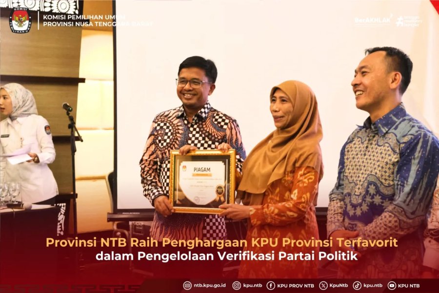KPU Provinsi NTB meraih penghargaan sebagai KPU Provinsi Terfavorit pada Pengelolaan Tahapan Verifikasi Partai Politik dalam kegiatan Berbagi Pengalaman Tahapan Teknis Pemilu dan Pemilihan Tahun 2024. Penghargaan diterima oleh Kadiv Teknis Penyelenggaraan KPU NTB Zuriati yang sedang mengikuti kegiatan Rakor di Bali dari tanggal 30 Juli sampai dengan 1 Agustus 2024.
