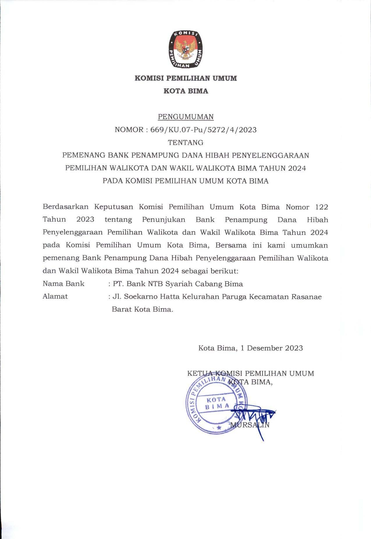 PEMENANG BANK PENAMPUNG DANA HIBAH PENYELENGGARAAN PEMILIHAN WALIKOTA DAN WAKIL WALIKOTA BIMA TAHUN 2024 PADA KOMISI PEMILIHAN UMUM KOTA BIMA