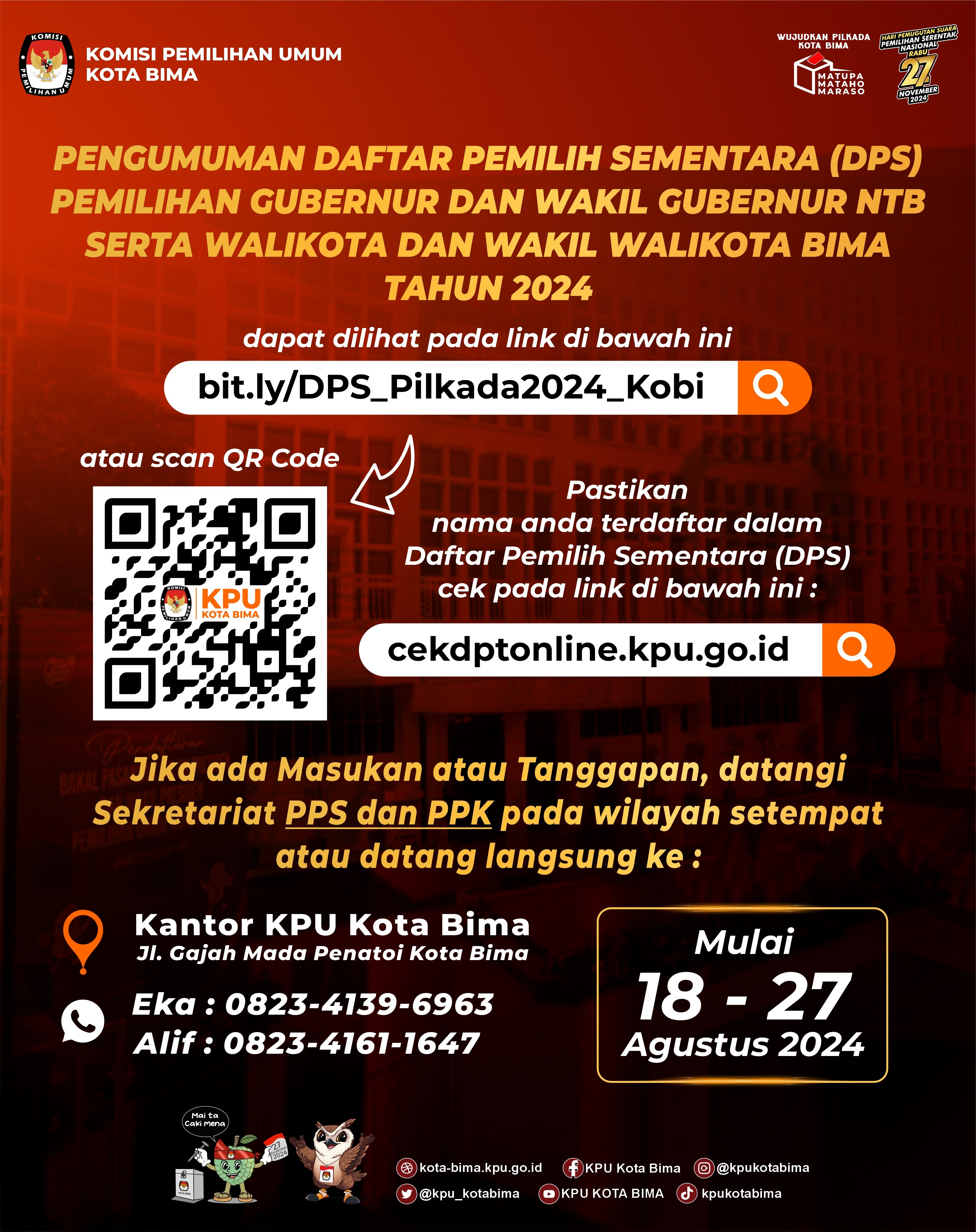 #TemanPemilih Berikut kami sampaikan Pengumuman Daftar Pemilih Sementara (DPS) dalam Pemilihan Gubernur dan Wakil Gubernur NTB serta Walikota dan Wakil Walikota Bima Tahun 2024.