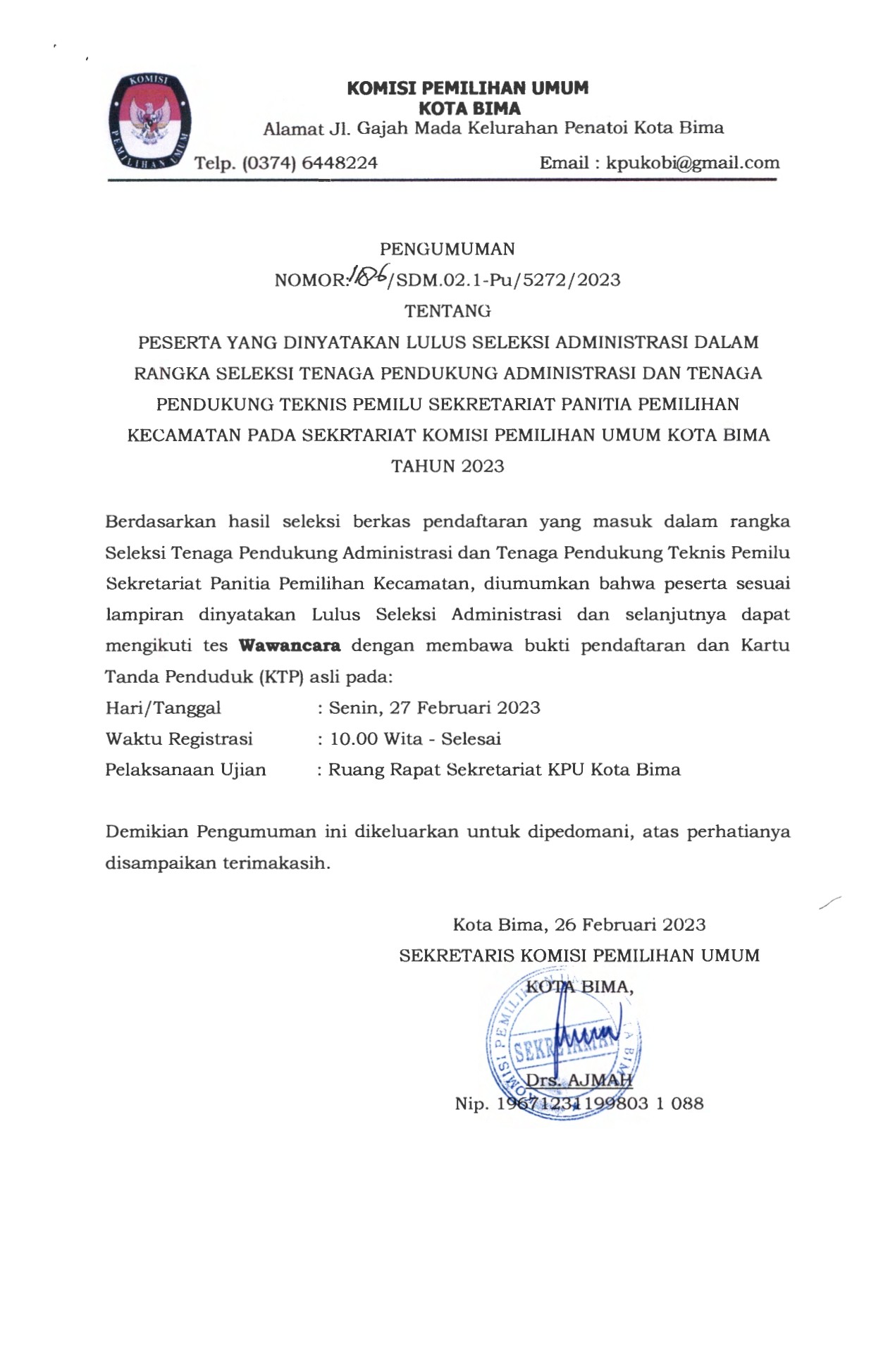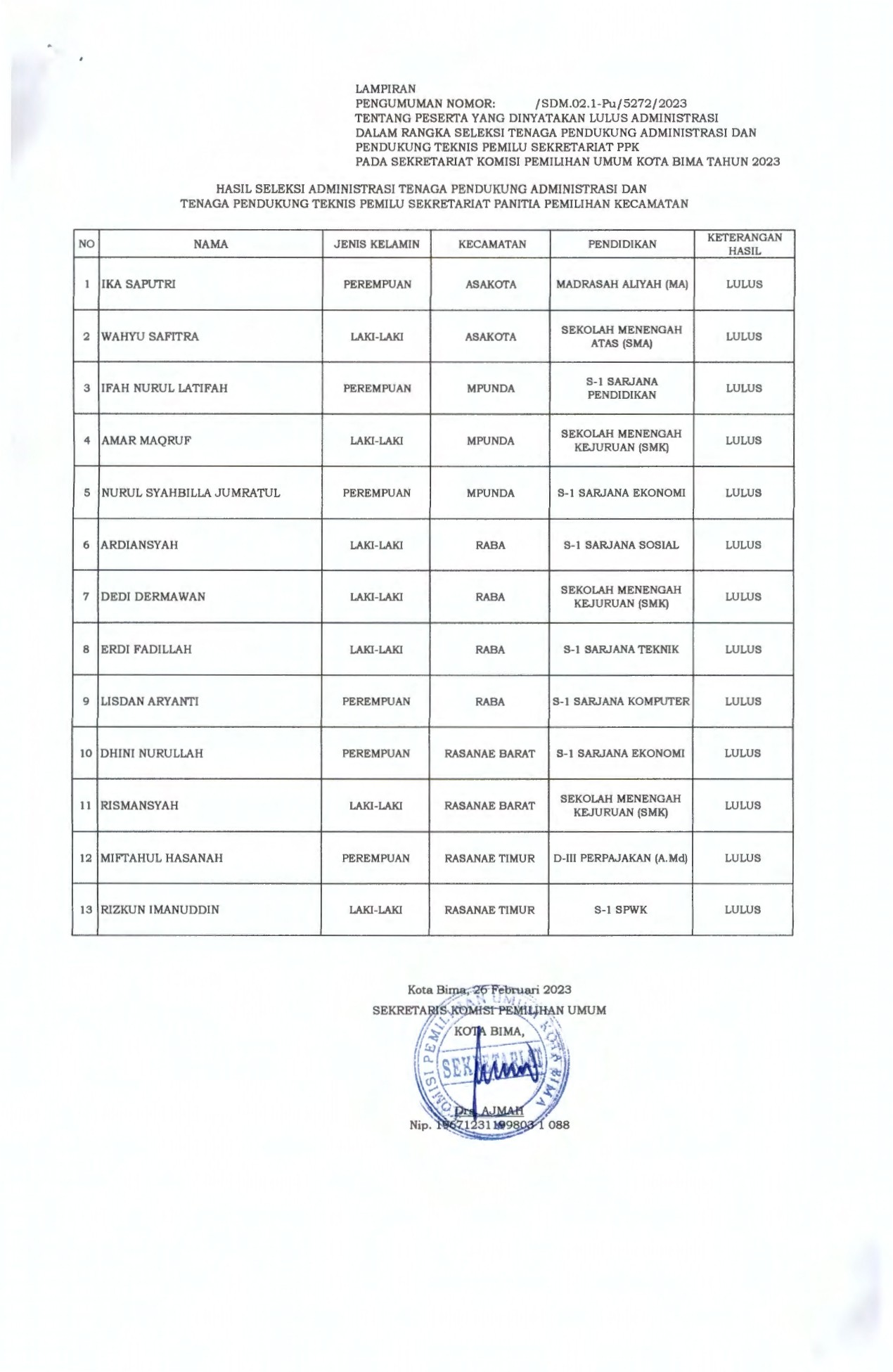 PENGUMUMAN KELULUSAN SELEKSI ADMINISTRASI TENAGA PENDUKUNG TEKNIS DAN ADMINISTRASI PADA SEKRETARIAT PPK