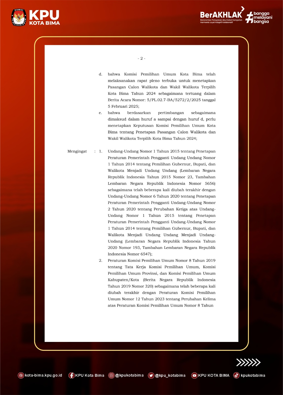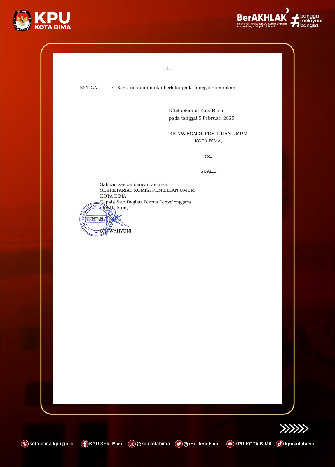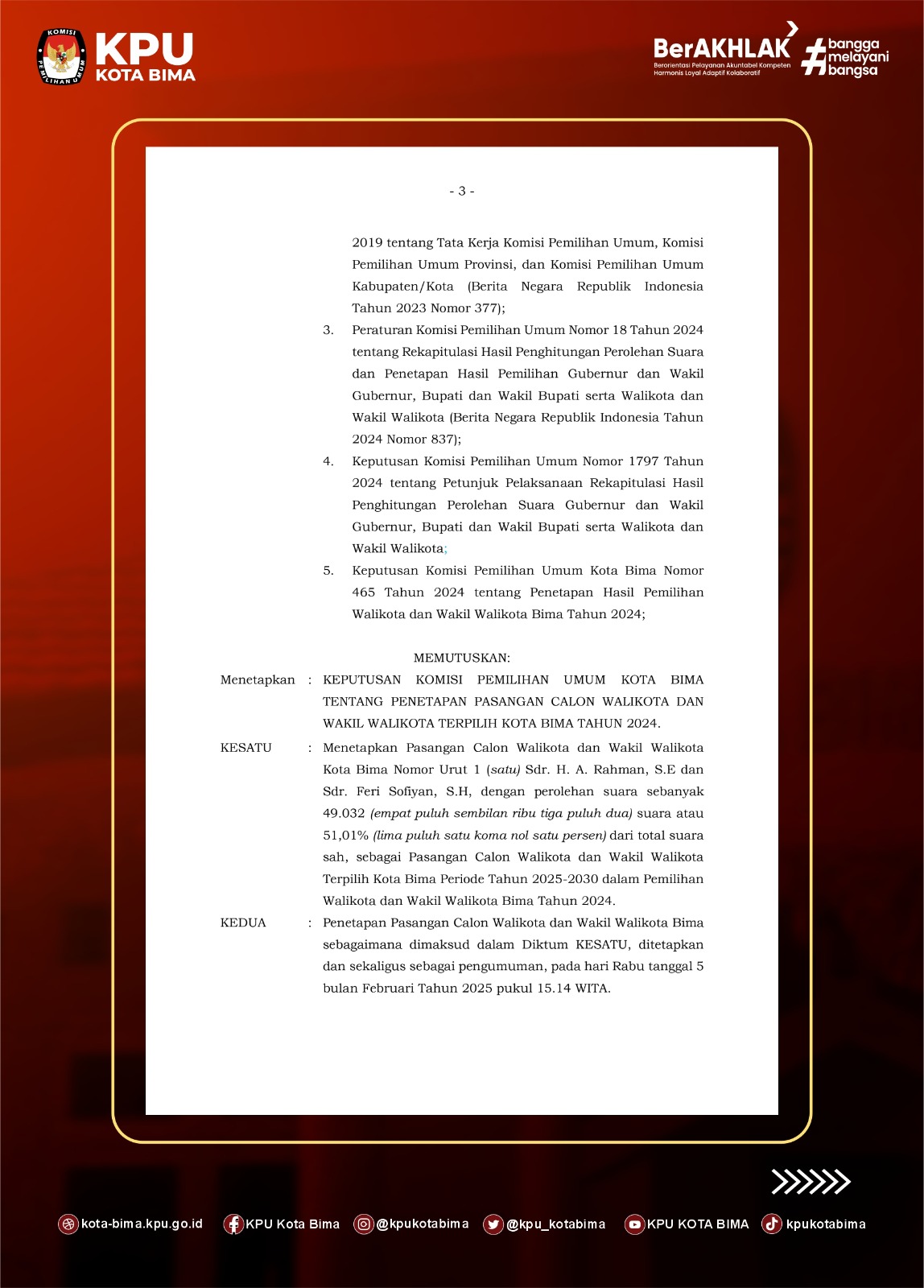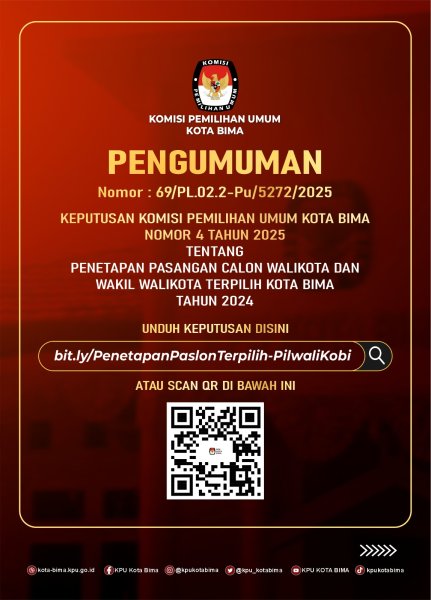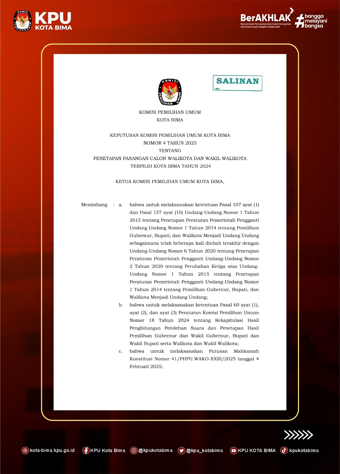 Pengumuman Keputusan Komisi Pemilihan Umum Kota Bima Nomor 4 Tahun 2025 Tentang Penetapan Pasangan Calon Walikota dan Wakil Walikota Terpilih Kota Bima Tahun 2024
