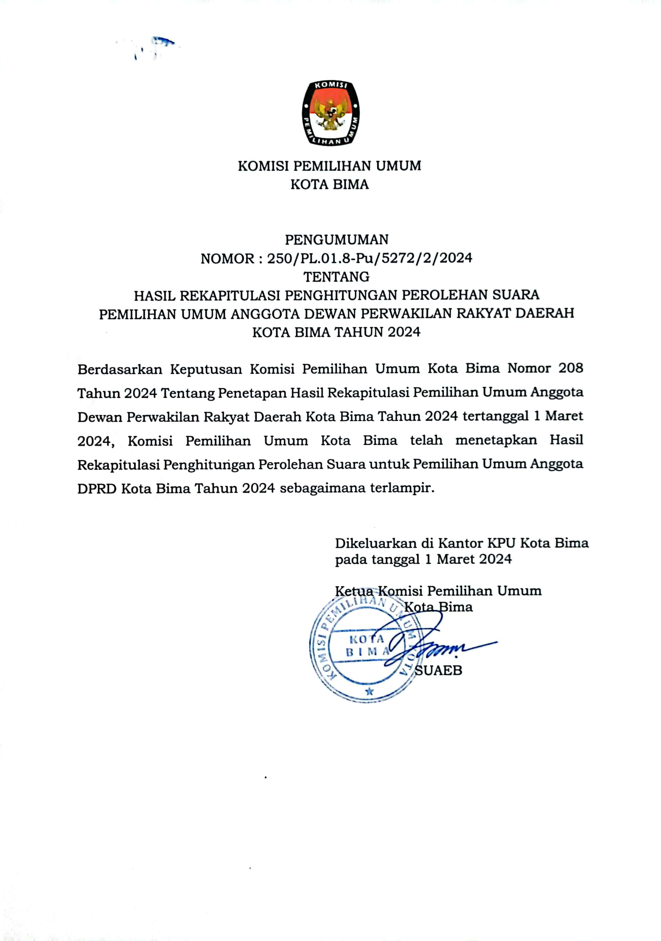 PENGUMUMAN NOMOR : 250/PL.01.8-Pu/5272/2/2024 TENTANG HASIL REKAPITULASI PENGHITUNGAN PEROLEHAN SUARA PEMILIHAN UMUM ANGGOTA DEWAN PERWAKILAN RAKYAT DAERAH KOTA BIMA TAHUN 2024 Jumat, 01 Maret 2024 23:00 435 LIHAT HASIL REKAPITULASI PENGHITUNGAN PEROLEHAN SUARA PEMILIHAN UMUM ANGGOTA DEWAN PERWAKILAN RAKYAT DAERAH KOTA BIMA TAHUN 2024 Bagikan: Dilihat 435 Kali.