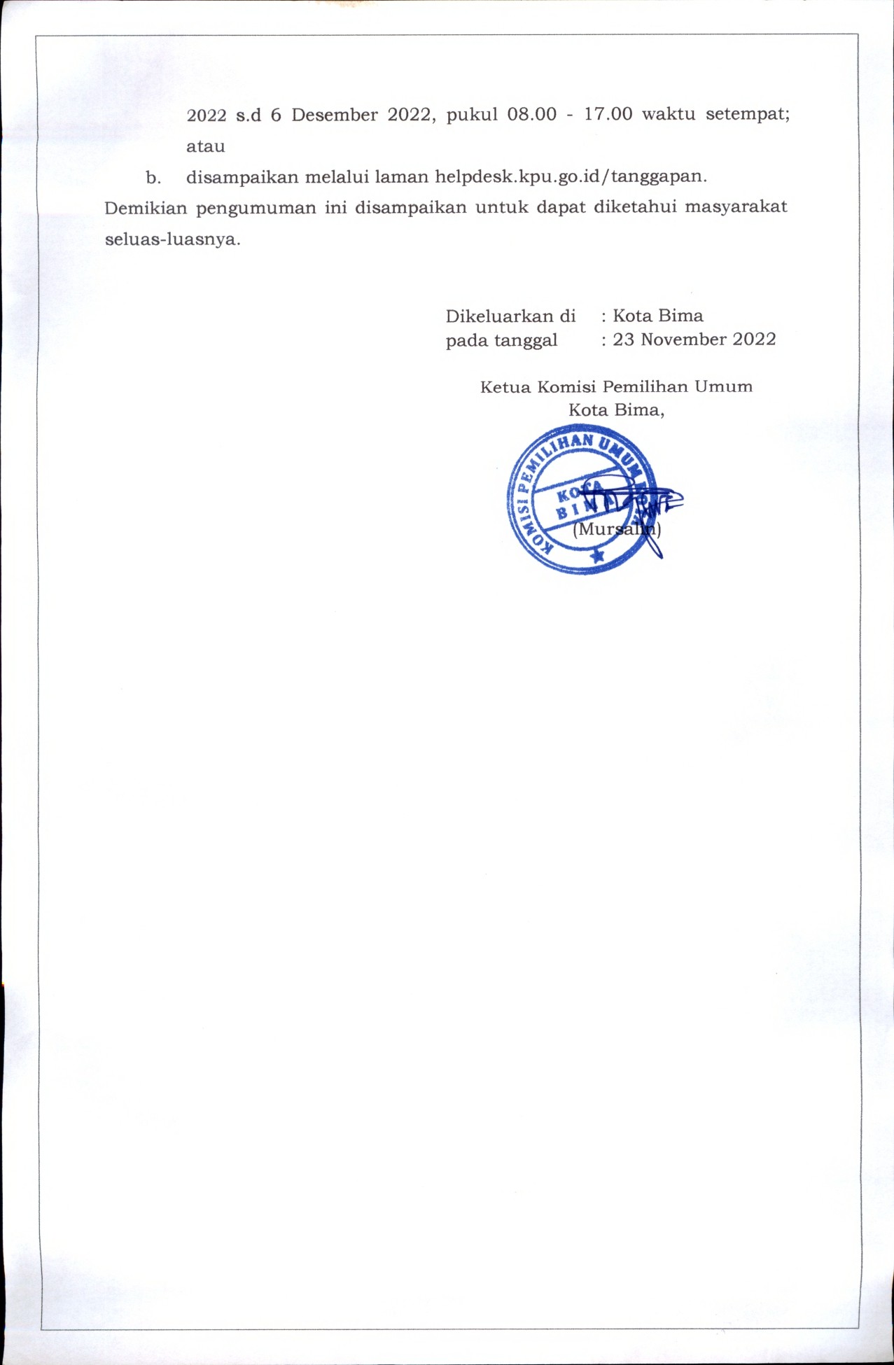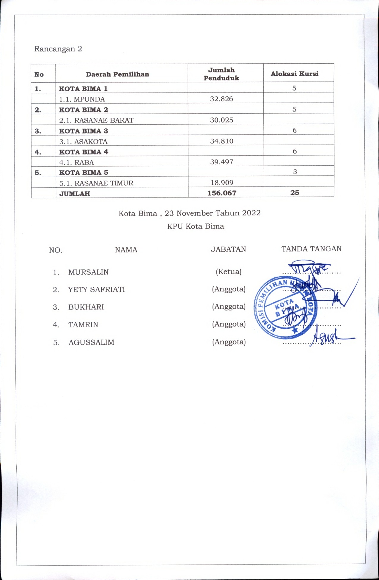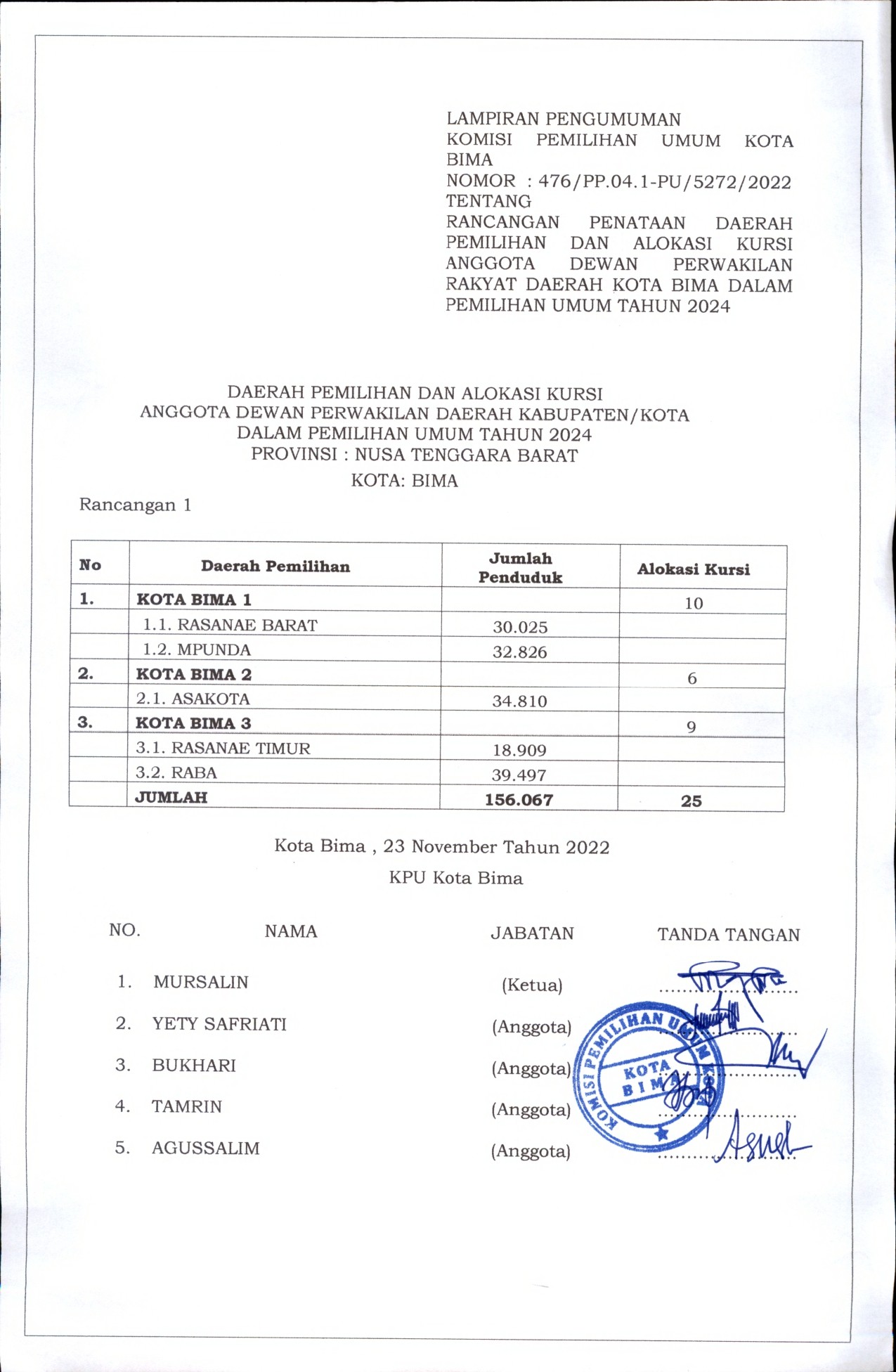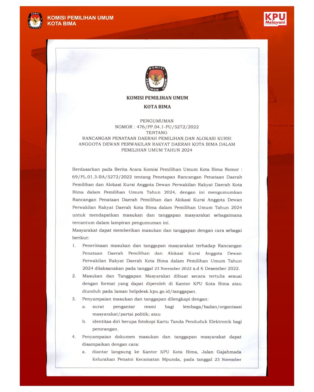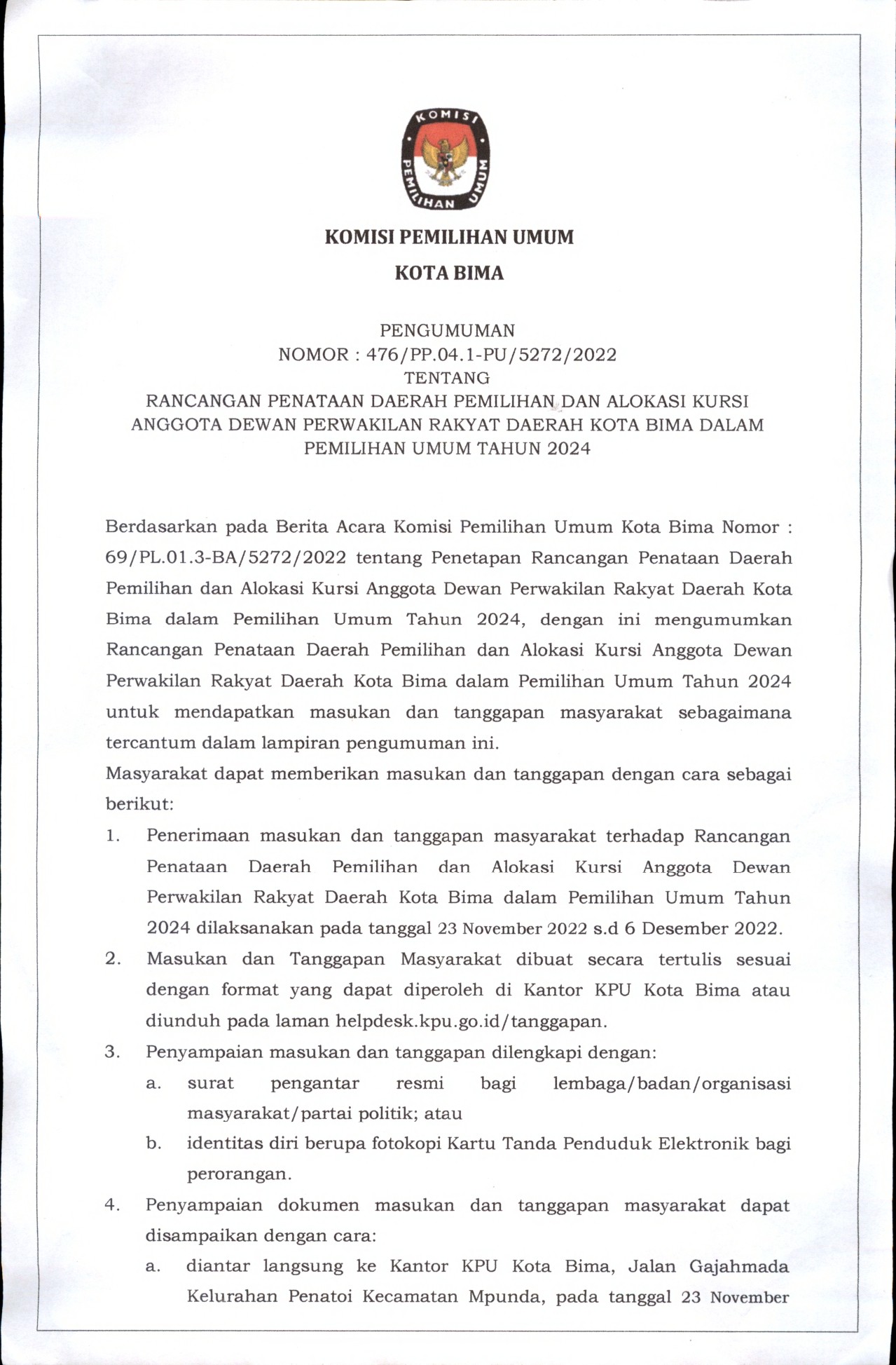PENGUMUMAN NOMOR : 476/PP.04.1-Pu/5272/2022 RANCANGAN PENATAAN DAERAH PEMILIHAN DAN ALOKASI KURSI ANGGOTA DEWAN PERWAKILAN RAKYAT DAERAH KOTA BIMA DALAM PEMILIHAN UMUM TAHUN 2024