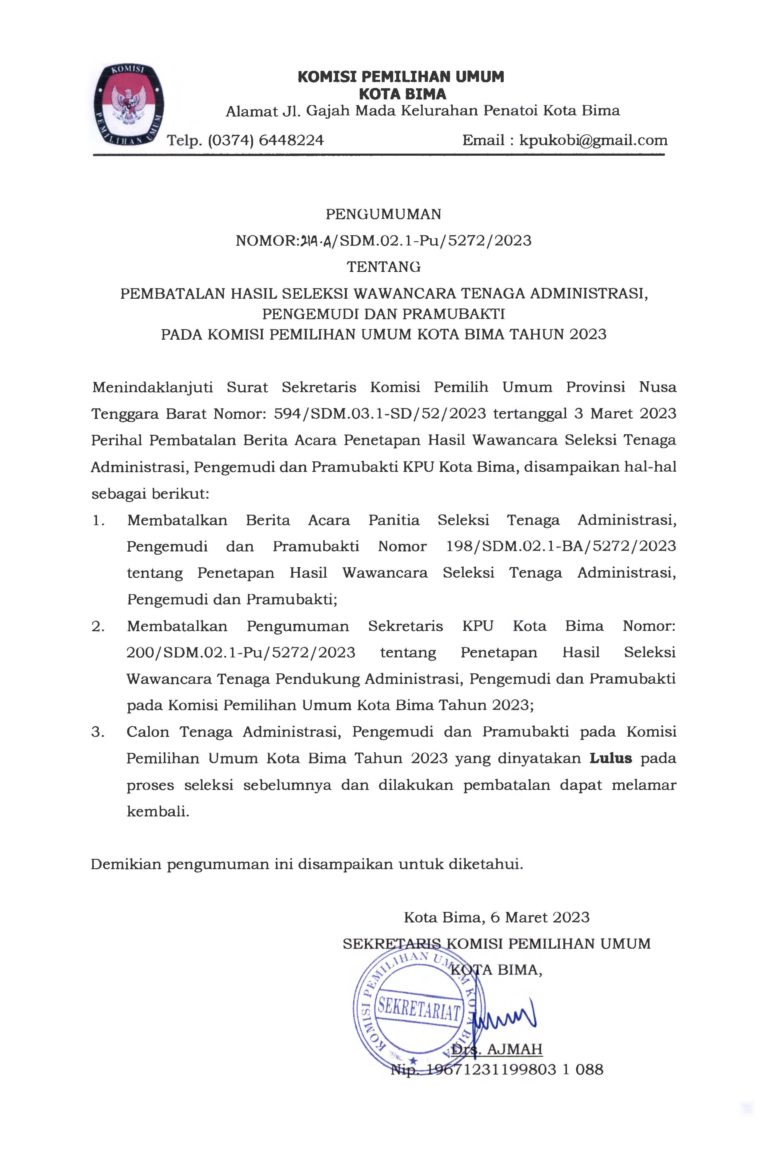 PENGUMUMAN PEMBATALAN HASIL SELEKSI WAWANCARA TENAGA ADMINISTRASI, PENGEMUDI DAN PRAMUBAKTI KOMISI PEMILIHAN UMUM KOTA BIMA TAHUN 2023