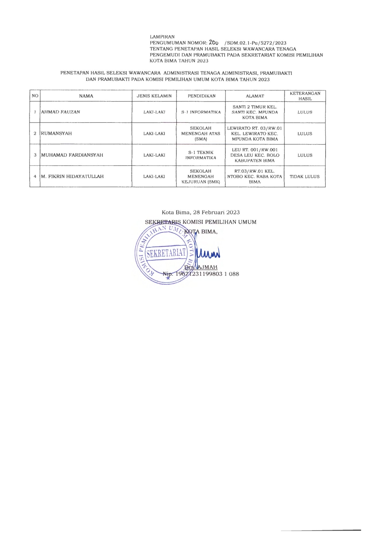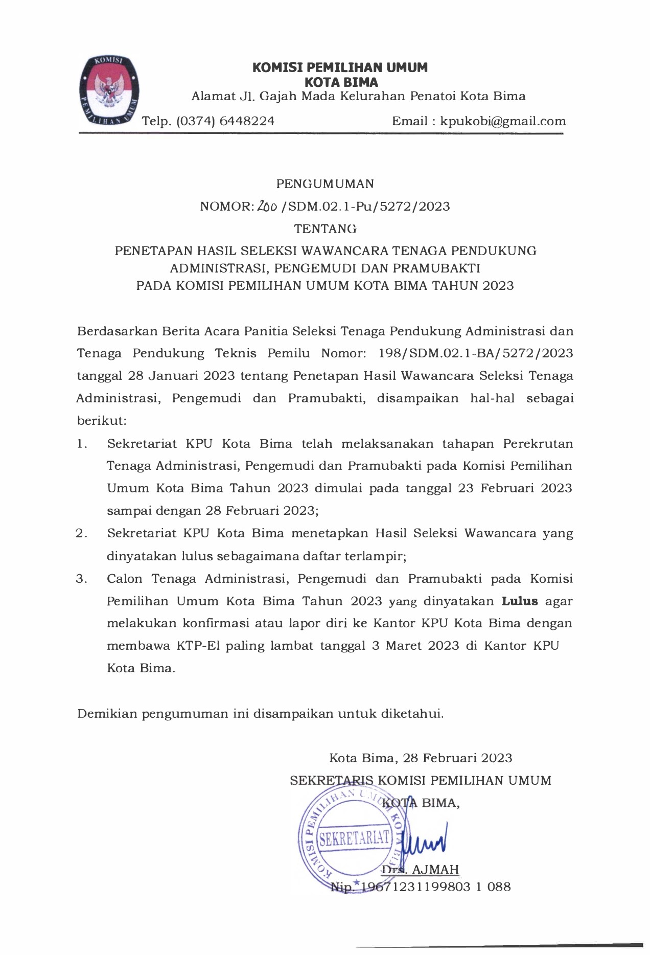 PENGUMUMAN PENETAPAN HASIL SELEKSI WAWANCARA TENAGA PENDUKUNG KPU KOTA BIMA