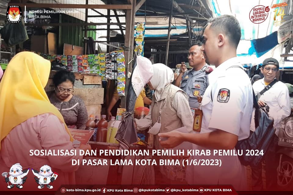 Teman Pemilih, hari ini, Kamis tanggal 1 Juni 2023 merupakan hari ke enam pelaksanaan Kirab Pemilu Tahun 2024 Jalur VI di KPU Kota Bima. Kegiatan kedua yang kami laksanakan adalah Sosialisasi keliling di Pasar Senggol Kota Bima.