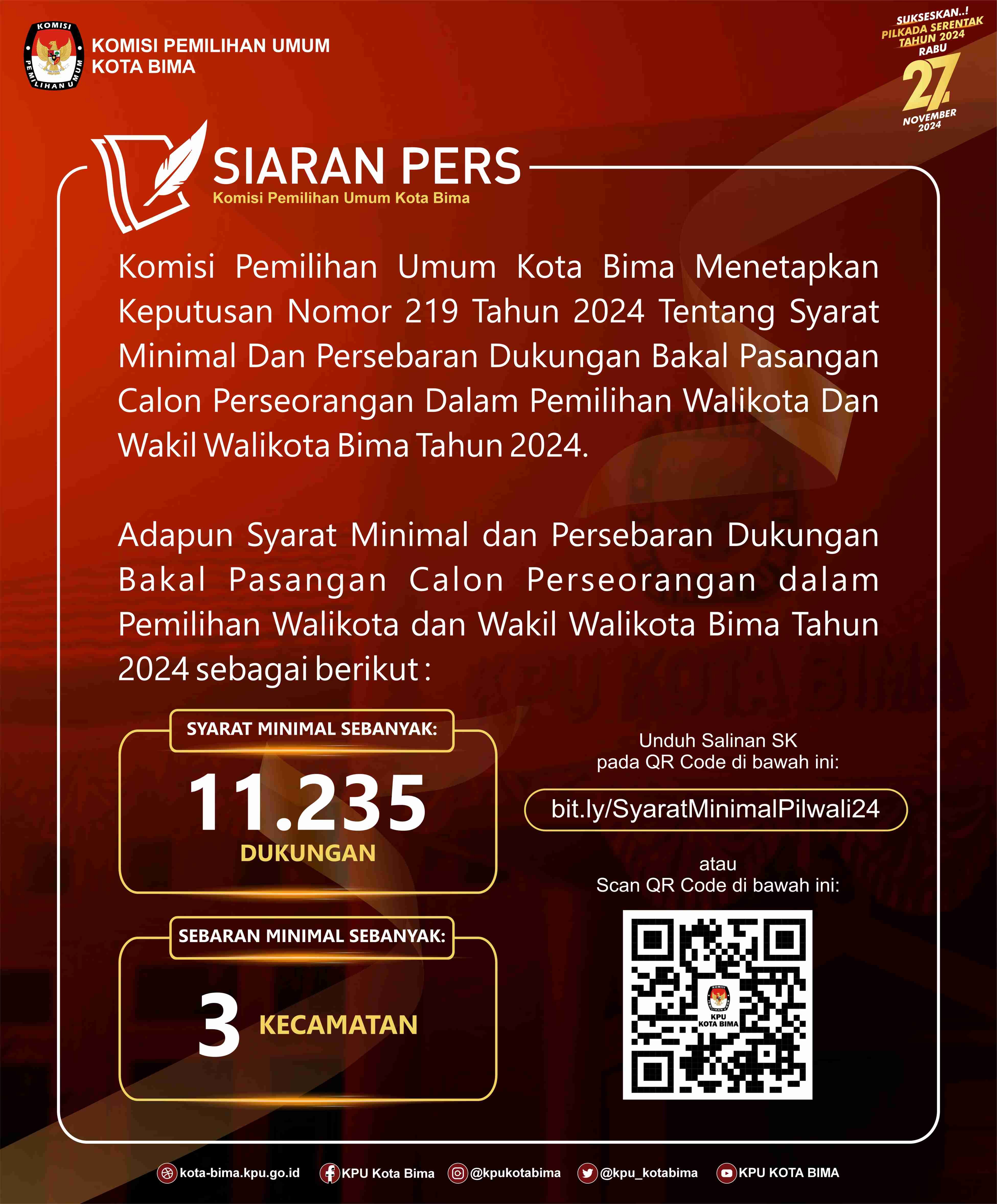 KOTA BIMA, Komisi Pemilihan Umum (KPU) Kota Bima melalui Surat Keputusan KPU Kota Bima Nomor: 219 menetapkan, jumlah syarat minimal dukungan bakal Pasangan Calon Perseorangan dalam Pemilihan Wali Kota dan Wakil Wali Kota Bima Tahun 2024 sebanyak 11.235 dukungan. Dengan persebaran dukungan minimal di 3 kecamatan yang ada di Kota Bima.